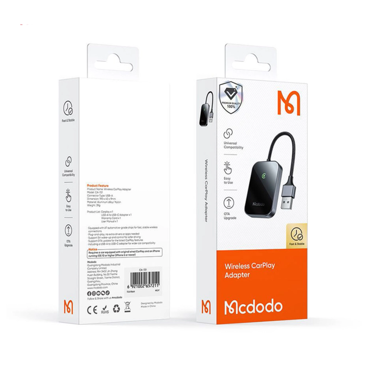 یکی از بزرگترین مزایای دانگل مک دودو CA-721، قابلیت Plug-and-Play آن است. به این معنی که شما نیازی به نصب درایور یا برنامه اضافی برای استفاده از این دانگل ندارید. تنها کافی است دانگل را به پورت USB خودرو متصل کرده و آن را با آیفون خود هماهنگ کنید. پس از اتصال اولیه، سیستم بهطور خودکار از CarPlay بیسیم پشتیبانی خواهد کرد و شما میتوانید بهراحتی از قابلیتهای CarPlay بدون نیاز به کابل استفاده کنید.