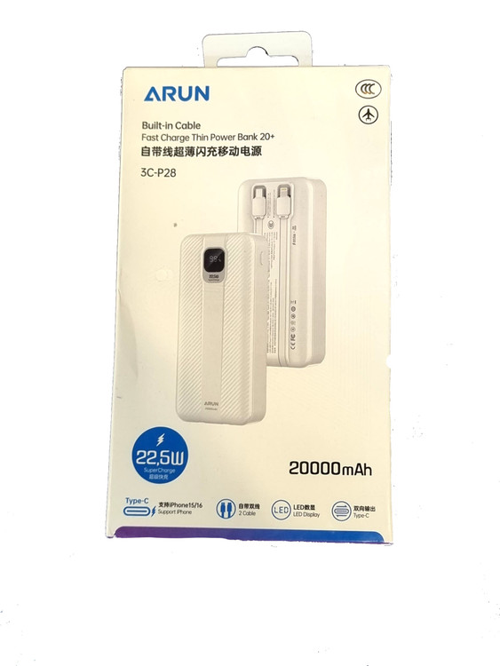 پاور بانک ۲۰۰۰۰ میلی آمپر ساعتی با حداکثر توان شارژ ۲۲.۵ واتی برند ARUN میباشد که دارای دو کابل لایتنینگ و USB-C پیوسته میباشد .